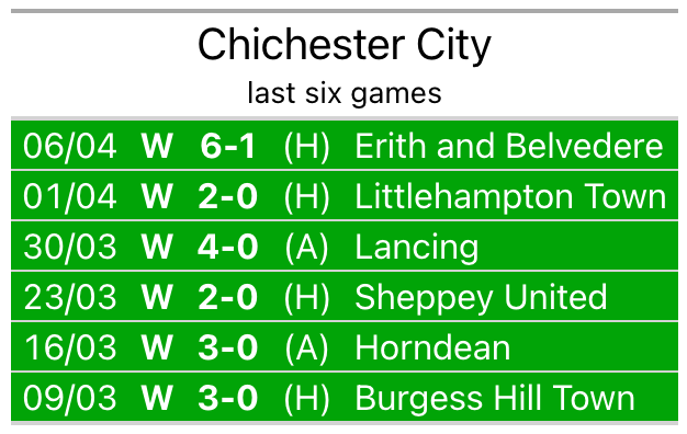 Chichester beat Erith and Belvedere 6-1 last time out, also on April 6.