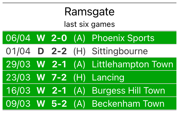 But with six wins and no losses over that period, the visitors’ form is even better – they have taken 18 points from 18, compared to Ramsgate’s 16.