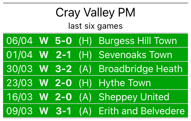 Cray Valley PM beat Burgess Hill Town 5-0 last time out, also on April 6.