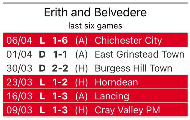 Erith & Belvedere are bottom of the table after 34 games, of which they have won five and drawn seven, earning 22 points.