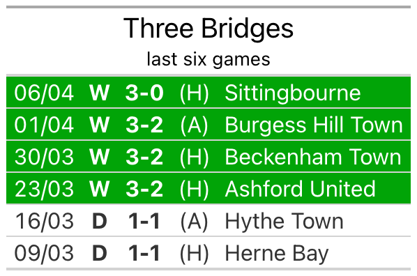 Three Bridges beat Sittingbourne 3-0 last time out, also on April 6.