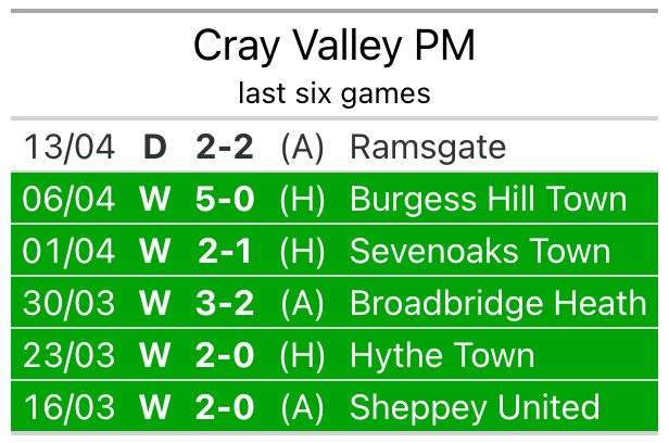 Cray Valley PM are on an excellent run ahead of hosting Herne Bay on Saturday, with 16 points collected from their last six games.