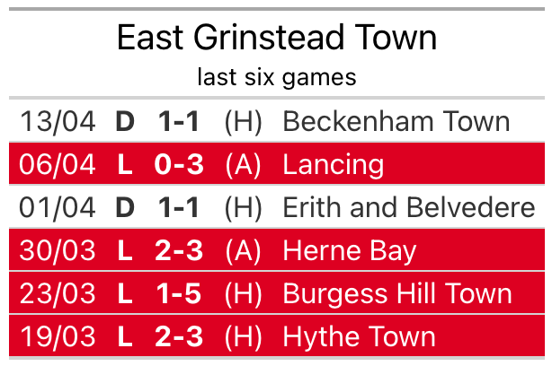 East Grinstead drew 1-1 with Beckenham Town last time out, also on April 13.