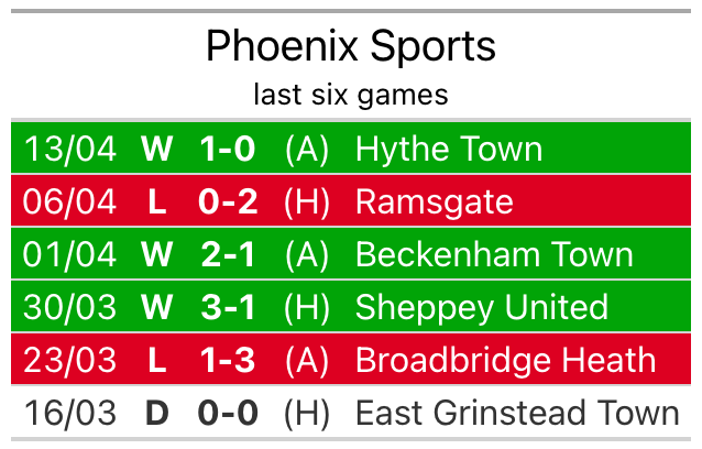 Phoenix Sports, meanwhile, won their last match, 1-0 against Hythe Town.