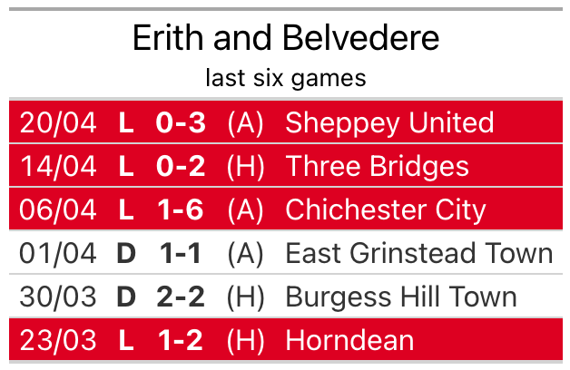 Erith and Belvedere are on a terrible run ahead of hosting Merstham on Saturday, with just two points collected from their last six games.