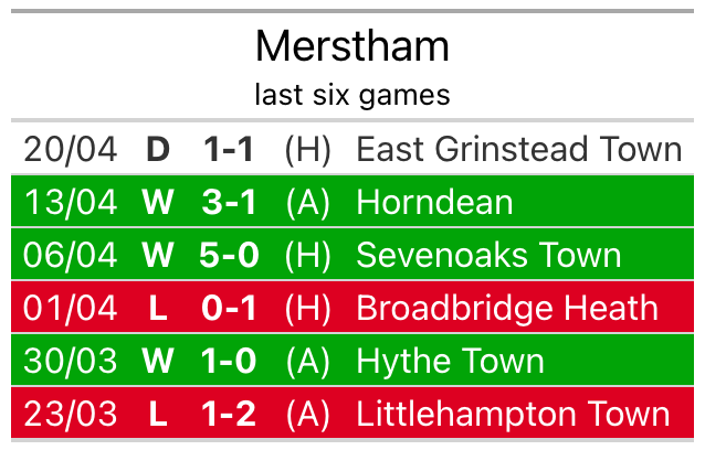 Merstham drew 1-1 with East Grinstead Town last time out, also on April 20.