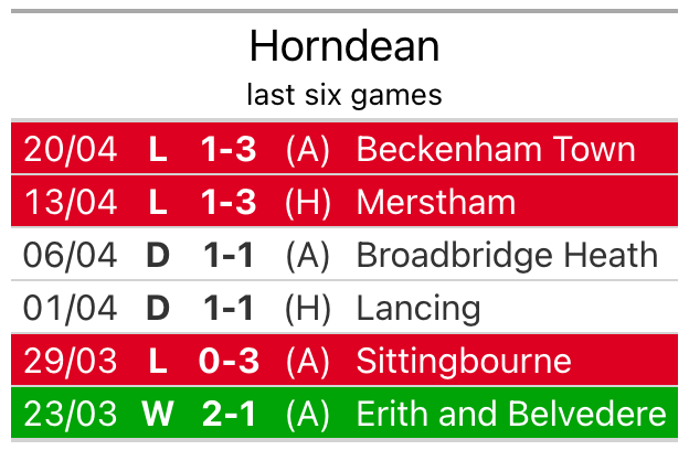 Horndean’s last match was on April 20, a 3-1 loss against Beckenham Town.