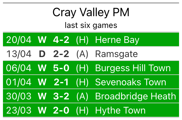 Cray Valley PM beat Herne Bay 4-2 last time out, also on April 20.