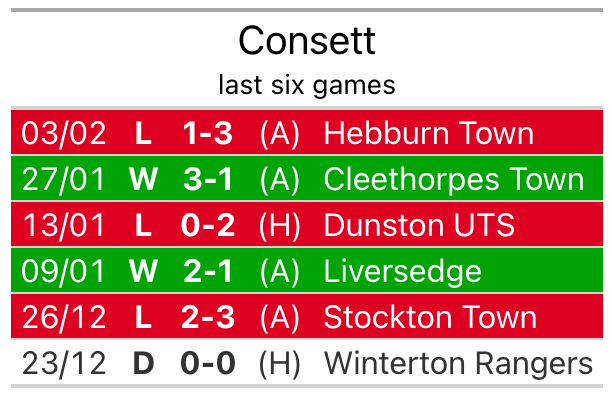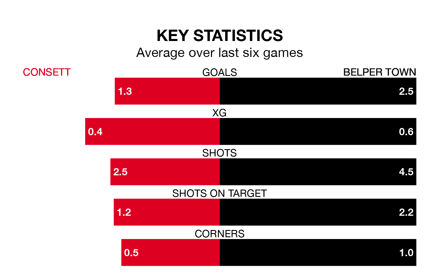 With five wins and one loss over that period, the away side’s form is much better – they have taken 15 points from 18, compared to Consett’s seven.