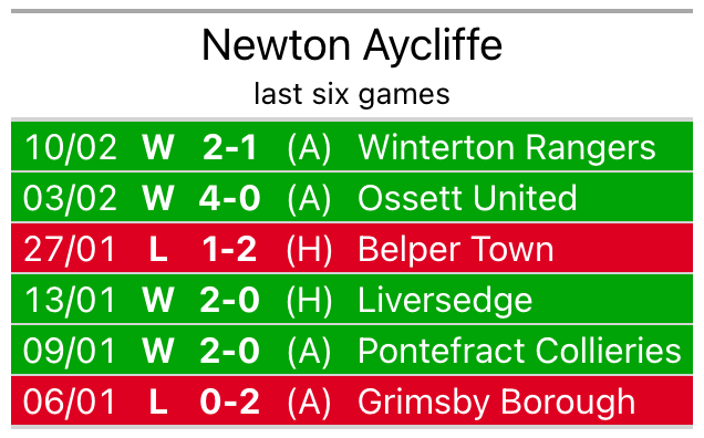 In their last league match, on February 10, Newton Aycliffe beat Winterton Rangers 2-1 away.