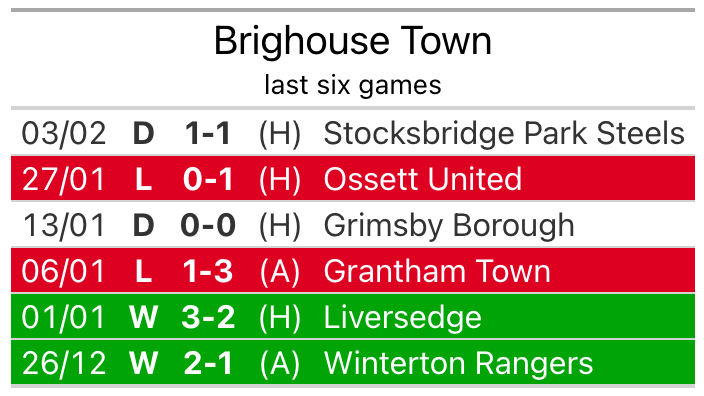 Brighouse drew, 1-1 at home against Stocksbridge Park Steels on February 3.