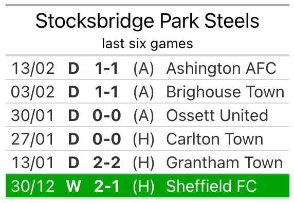 Stocksbridge’s last match was on Tuesday, a 1-1 draw against Ashington AFC.