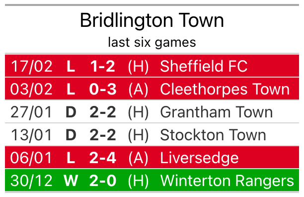 Bridlington have lost three and drawn two matches since they last earned three points – against Winterton Rangers on December 30.