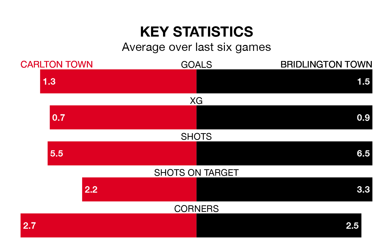Carlton Town are also below average scorers, with 1.4 goals per game, compared to a league average of 1.5. They have also conceded 1.4 goals per game.