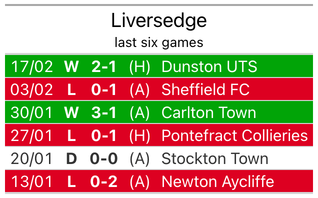 Liversedge’s last match was on Saturday, a 2-1 win against Dunston UTS.