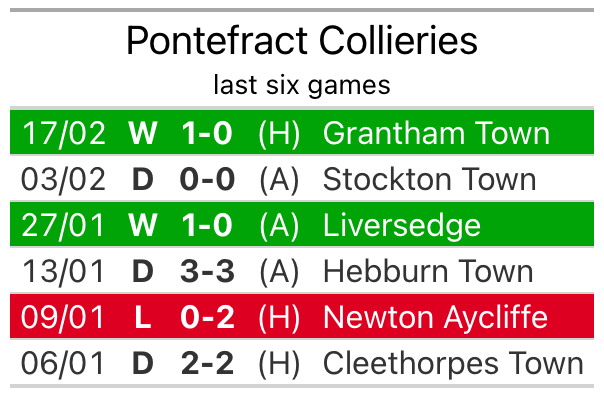 With two wins and three draws over that period, Pontefract Collieries’s form is similar – they have both taken nine points from 18.