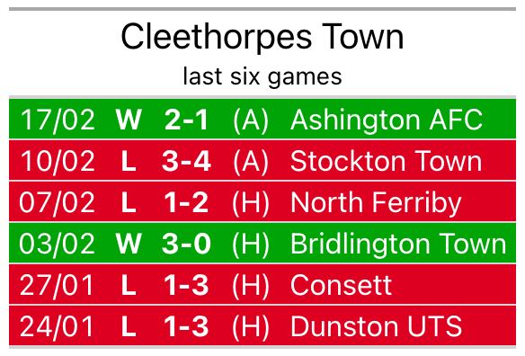 Cleethorpes’s last match was on Saturday, a 2-1 win against Ashington AFC.