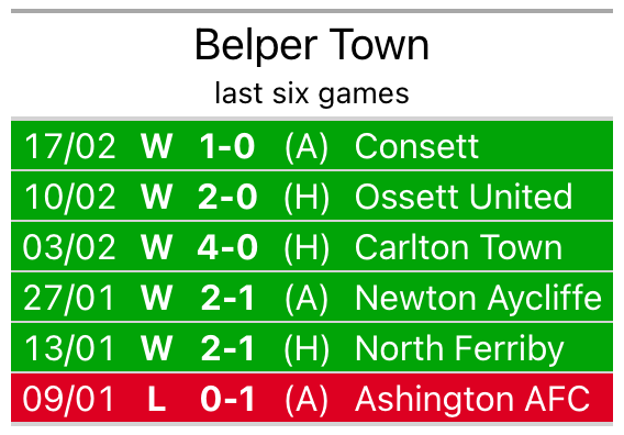 Belper beat Consett 1-0 last time out, also on Saturday.