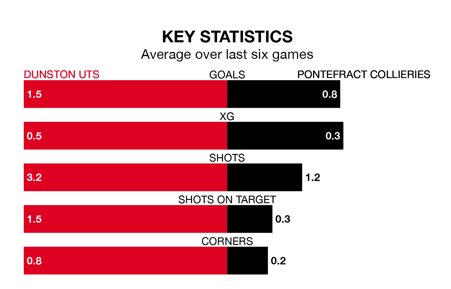 On average, Dunston UTS scored 2.5 goals and Pontefract Collieries 1.7 in those matches.