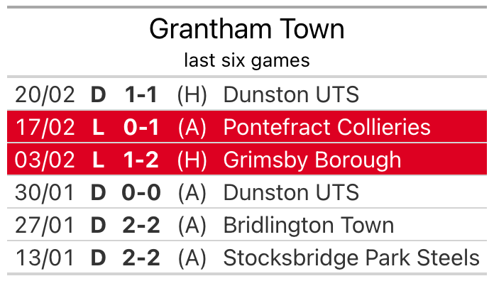 Grantham have lost two and drawn four matches since they last earned three points – against Brighouse Town on January 6.