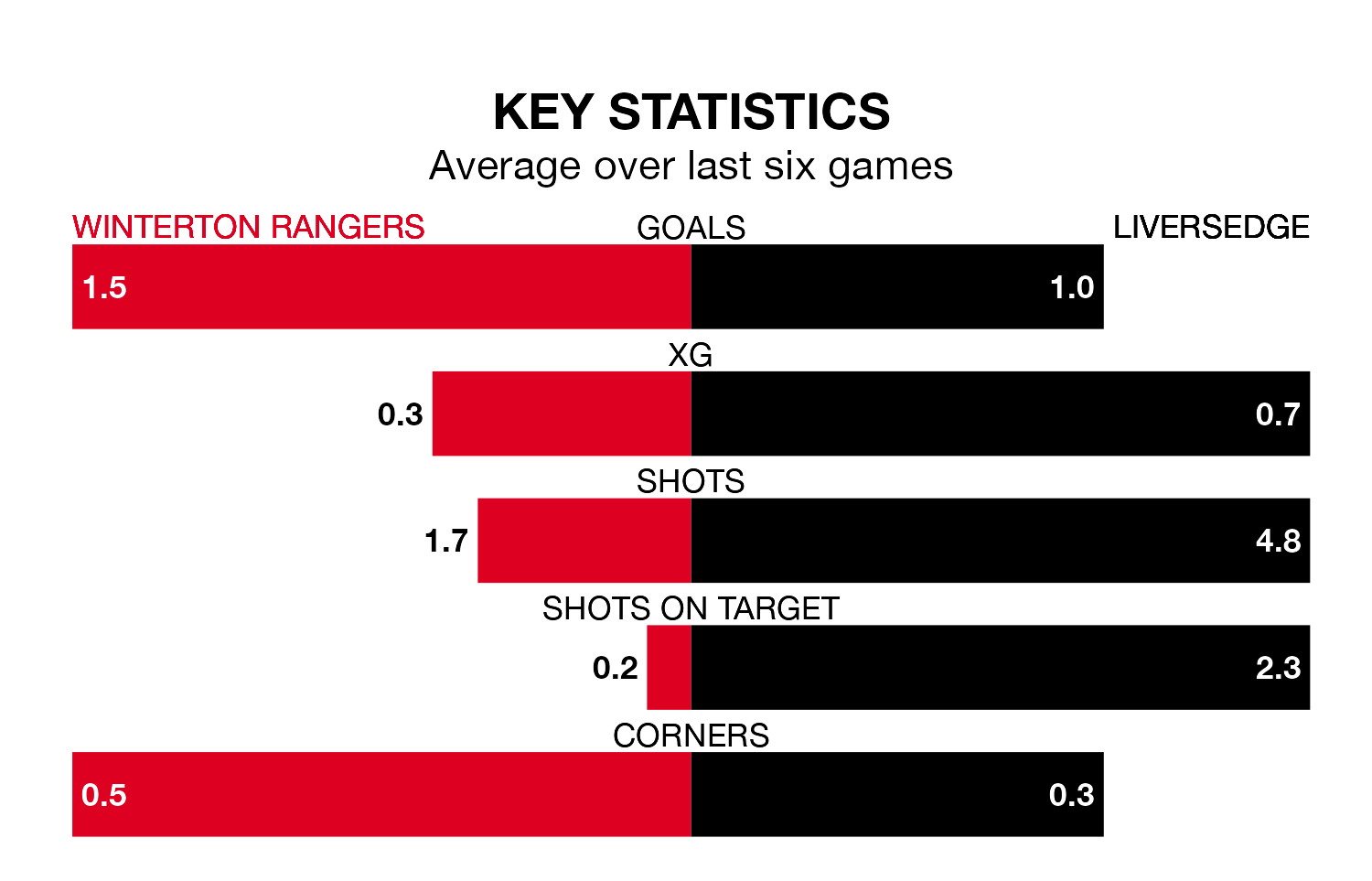 The away side are also below average scorers, with 1.4 goals per game, compared to a league average of 1.5. They have conceded 1.3 goals per game.