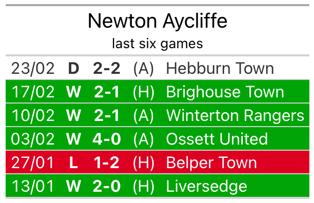 Newton Aycliffe are also above average scorers, with 1.7 goals per game, compared to a league average of 1.5. They have conceded 1.6 goals per game.