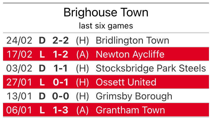 Brighouse drew 2-2 with Bridlington Town last time out, on February 24.