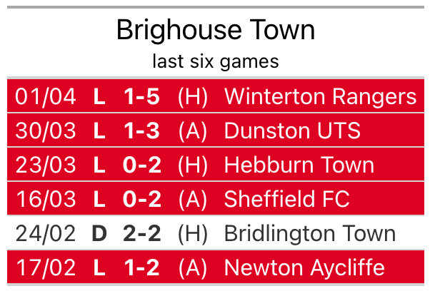 Brighouse’s struggles have left them with just one point from their last six Northern Premier League Division One – East matches, while their opponents have earned eight from a possible 18.