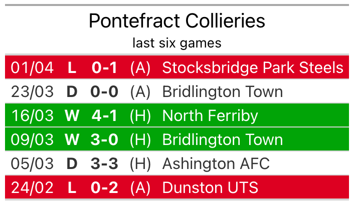 Pontefract Collieries, meanwhile, are above average scorers, with 1.7 goals per game, compared to a league average of 1.5. They have conceded 1.1 goals per game.
