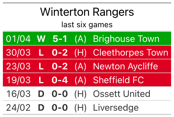 With a win and two draws over that period, Rangers’s form is worse – they have taken five points from 18, compared to Pontefract Collieries’s eight.