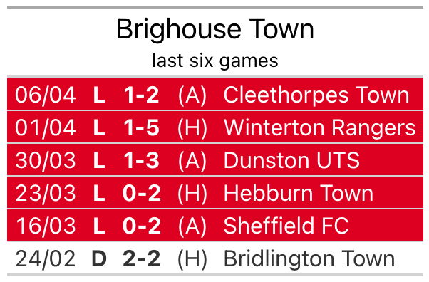 Brighouse’s last match was on April 6, a 2-1 loss against Cleethorpes Town.