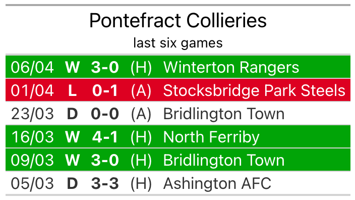 Pontefract Collieries beat Winterton Rangers 3-0 last time out, also on April 6.