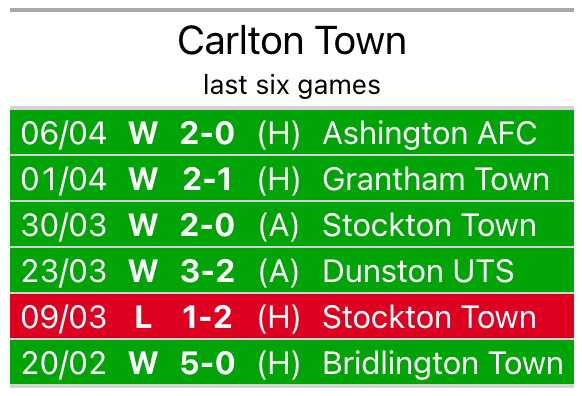 Carlton beat Ashington AFC 2-0 last time out, also on April 6.
