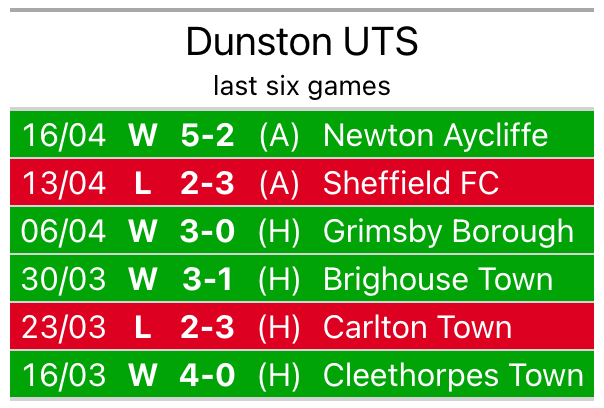 Dunston UTS, meanwhile, are above average scorers, with 2.0 goals per game, compared to a league average of 1.5. They have conceded 1.0 goal per game.