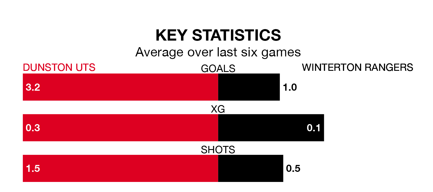 With two wins and four losses over that period, Rangers’s form is much worse – they have taken six points from 18, compared to Dunston UTS’s 12.