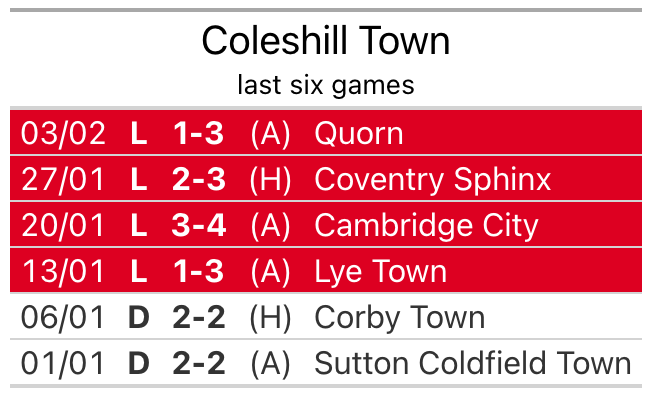 Coleshill’s last match was on February 3, a 3-1 loss against Quorn.