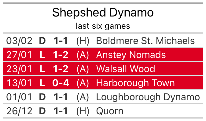 Shepshed Dynamo drew 1-1 with Boldmere St. Michaels last time out, also on February 3.