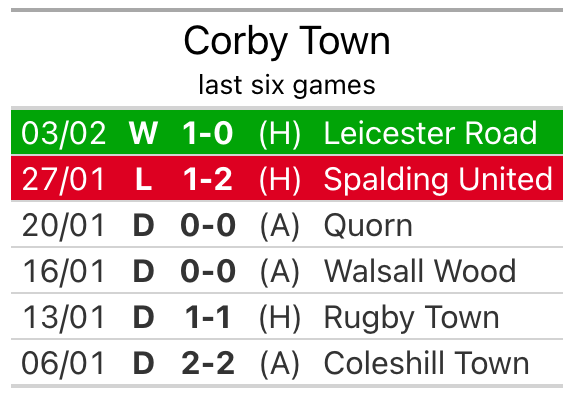 Corby beat Leicester Road 1-0 last time out, also on February 3.