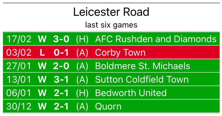 Leicester Road beat AFC Rushden and Diamonds 3-0 last time out, also on February 17.