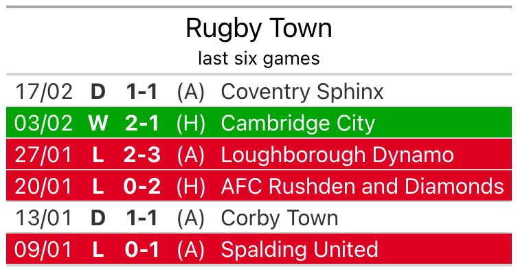 Rugby’s last match was on February 17, a 1-1 draw against Coventry Sphinx.