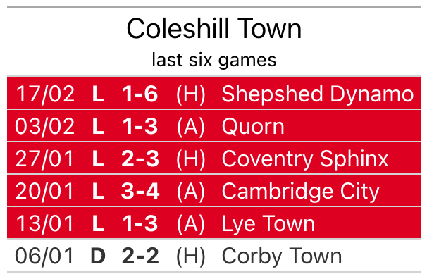 Coleshill lost 6-1 against Shepshed Dynamo last time out, also on February 17.