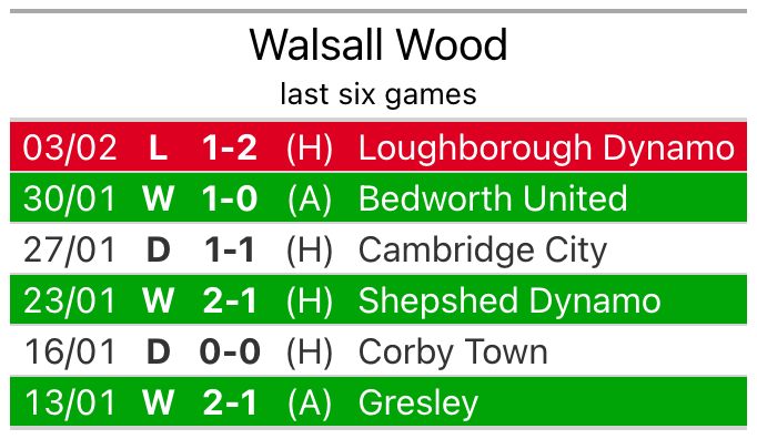 The visitors have drawn two and lost four of their last six fixtures, while Walsall Wood have three wins and two draws.