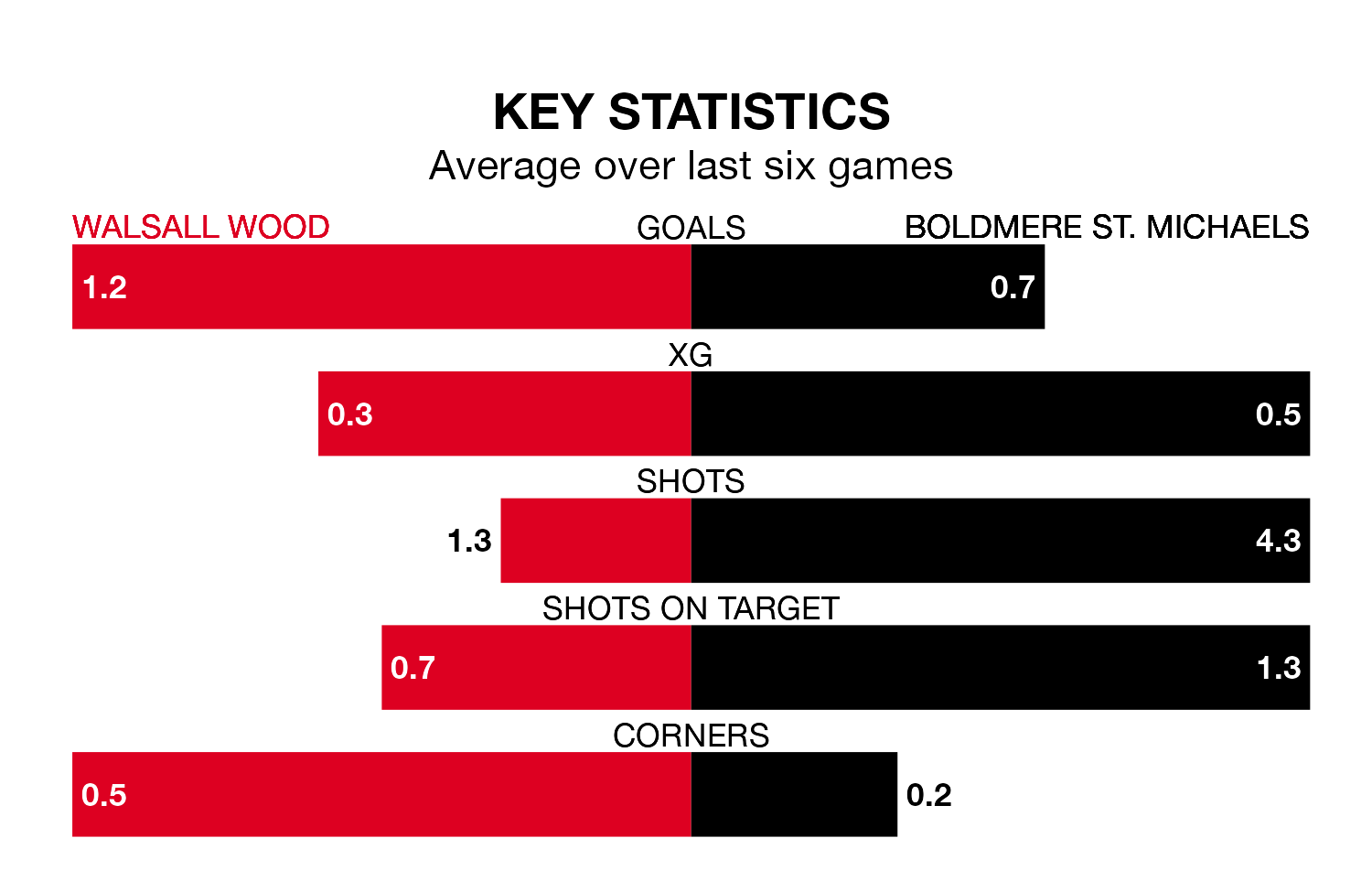 Walsall Wood are also above average scorers, with 1.6 goals per game, compared to a league average of 1.5. They have conceded 1.5 goals per game.
