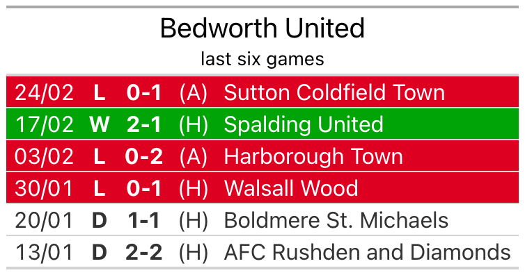 Bedworth, meanwhile, lost their last match, 1-0 against Sutton Coldfield Town.