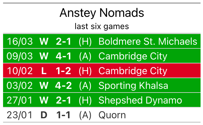 In their last league match, on March 16, Anstey Nomads beat Boldmere St. Michaels 2-1 at home.