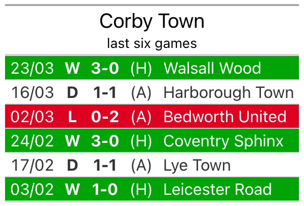 Corby also won, 3-0 at home against Walsall Wood on March 23.