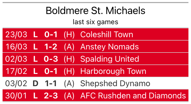 Boldmere St. Michaels’s last match was on March 23, a 1-0 loss against Coleshill Town.