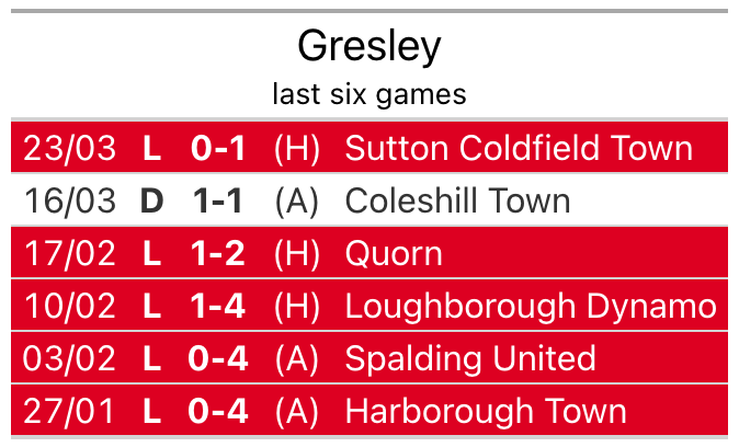 Gresley are 19th in the table after 31 games, of which they have won four and drawn seven, earning 19 points.