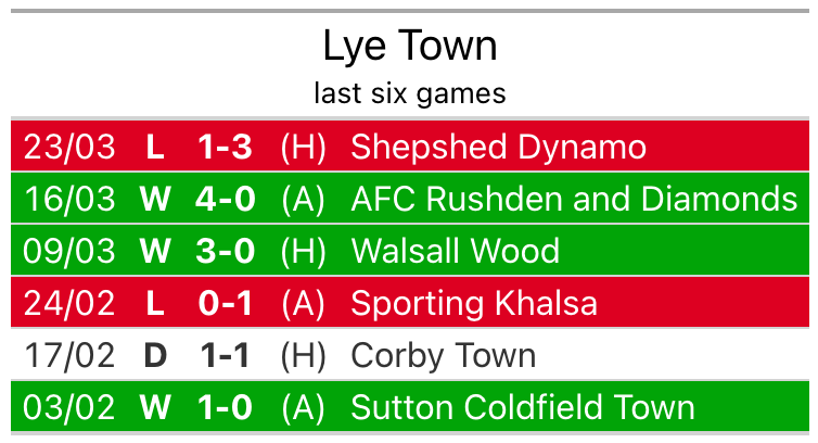 Lye lost 3-1 against Shepshed Dynamo last time out, also on March 23.