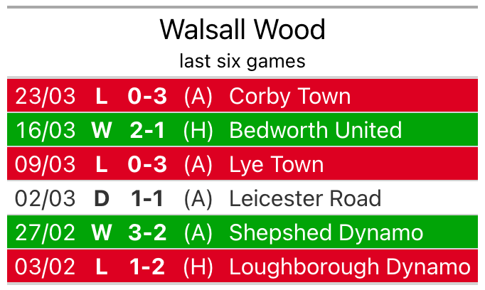 The visitors have won five and lost one of their last six fixtures, while Walsall Wood have two wins and a draw.